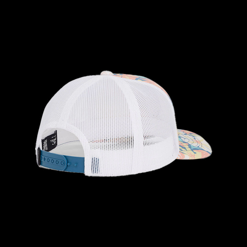 Il cappellino trucker Flood presenta un logo colorato sul davanti. Questo cappellino a sei pannelli in stile camionista ha una visiera curva, nastro interno e pannelli posteriori in mesh traspirante di poliestere riciclato. Include una chiusura snapback per una vestibilità regolabile ed è realizzato in 100% cotone.