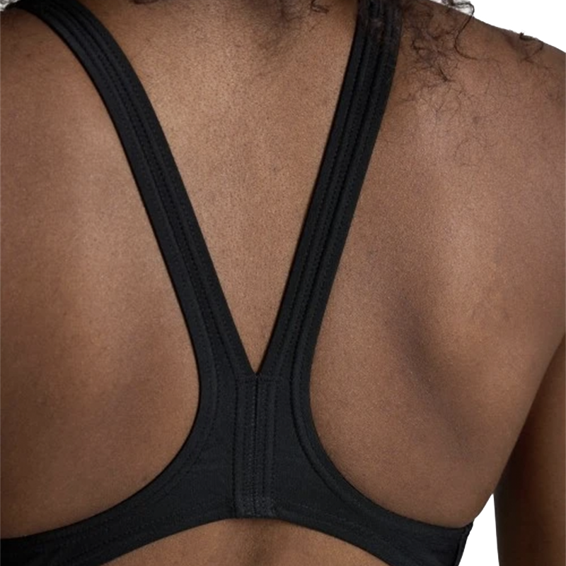 La classica vestibilità arena con una comoda apertura posteriore e ampie spalline di supporto.