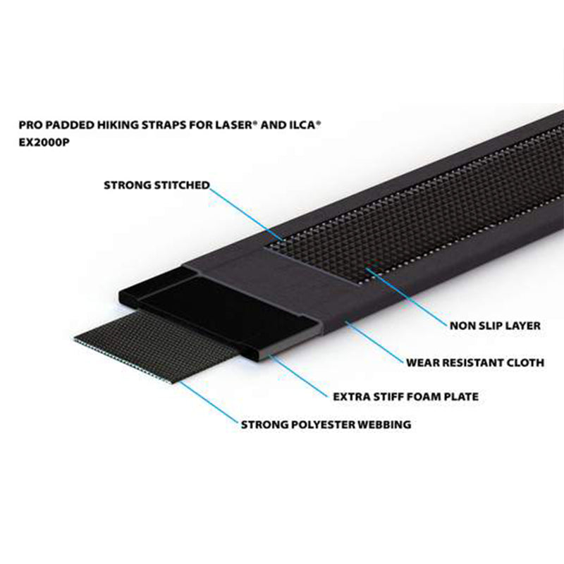 Cinghia da trekking imbottita PRO Laser® / ILCA® extra larga da 10 cm. Cinghia nera, parzialmente rivestita in tessuto nero antiusura, perfettamente resistente ai raggi UV. Imbottita con una piastra in schiuma a celle chiuse extra rigida che non assorbe acqua e dotata di un'impugnatura in gomma nella parte inferiore. Passante a poppa e fori di montaggio sulla parte anteriore.